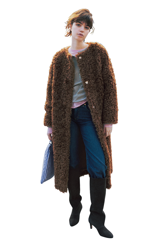 D.ブラウンノーカラーボアロングコート 70,400円/JAKKE(ジャック・オブ・オール・トレーズ プレスルーム) 羊を思わせるフェイクファーのロングコート。あたたかな見た目ながら着ぶくれしない、端正なノーカラーデザイン。重ね着もしやすく、もこもこさせるだけじゃない多彩な組み合わせが楽しめる。そで口はリブ編みのストームカフスで冷たい風を通しにくい。