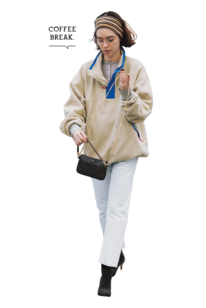 アウトドア感のあるフリースをかぶせて、さらに顔まわりもレトロな小物で飾りつけ。わかりやすい振り切るほうが、クリーンなデニムにとってはむしろ個性として作用。足元はヒールでわずかな緊張感を。