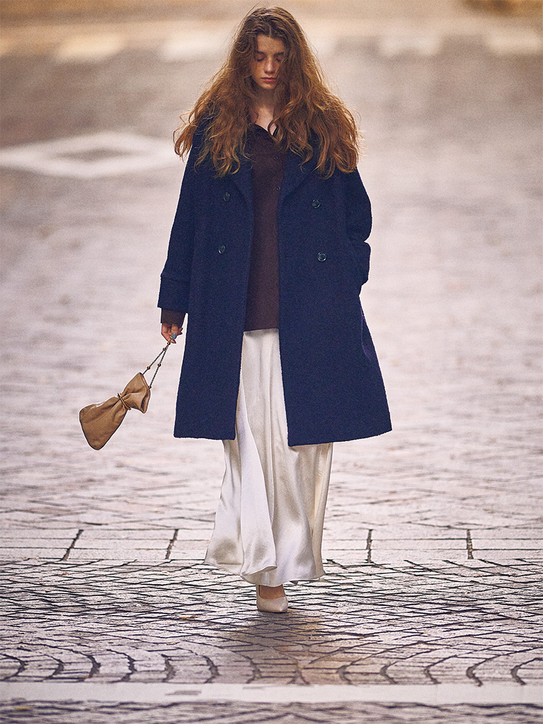 【POINT】ボトムを隠しすぎないミドル丈のコートだから、スカートの躍動感も自然と生きてくる。着くずしたシャツでいっそうのけだるさを。