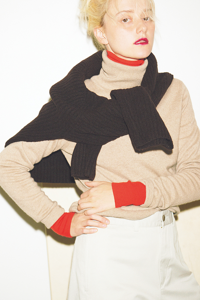 着ぶくれしがちなタートルネックどうしのレイヤードは、濃い色を中にすることで引き締まる。起毛感のあるカシミヤとリブ編みなど、風合いを変えてさらにメリハリを。