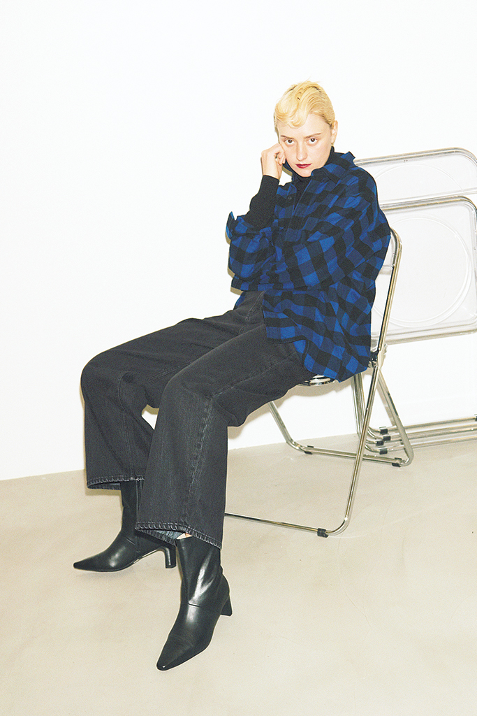 ともするとほっこりしがちなフランネルシャツは、細身の黒と合わせてスマートに寄せて。適度な厚みとぶかっとしたサイズにより、コートを着ない時季は羽織りとしても活躍。
