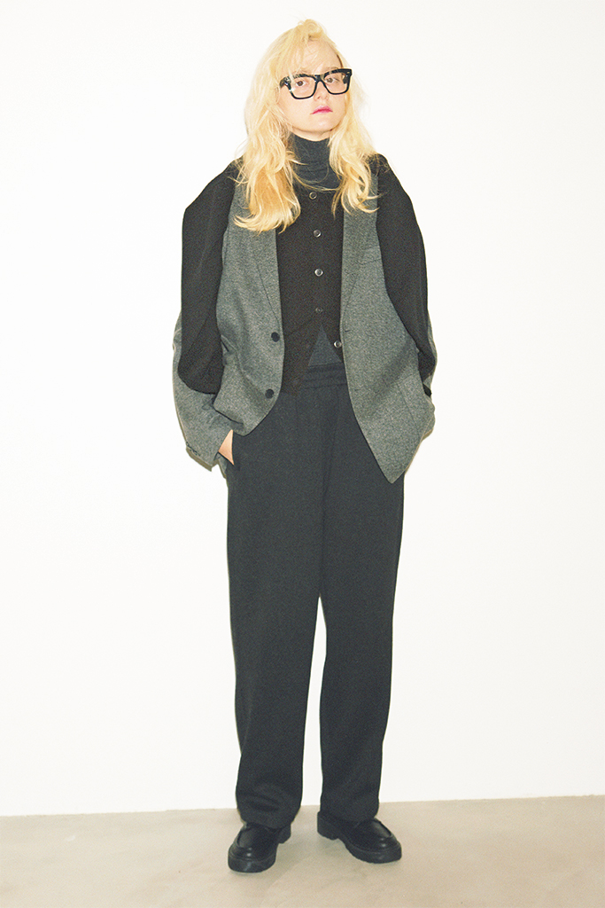 黒×グレーの硬派なマニッシュルックをサイズ感による余白で親しみやすく。ベスト感覚で細身のカーデを仕込み、全体のゆるみを軽減。