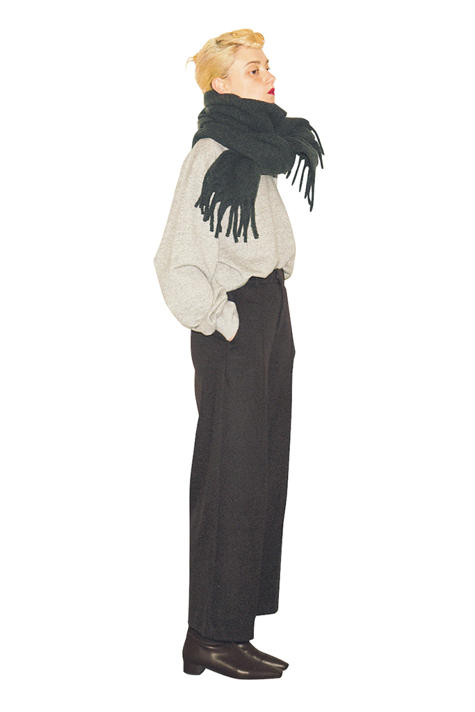 ワイドパンツに合わせるときは、タックINして腰まわりをすっきりと。落ち感があるため、ウエスト部分がもたつきにくい。ゆるい服を上下でつなげるときは、パンツと靴の色はそろえて、脚を長く見せるひと工夫を。