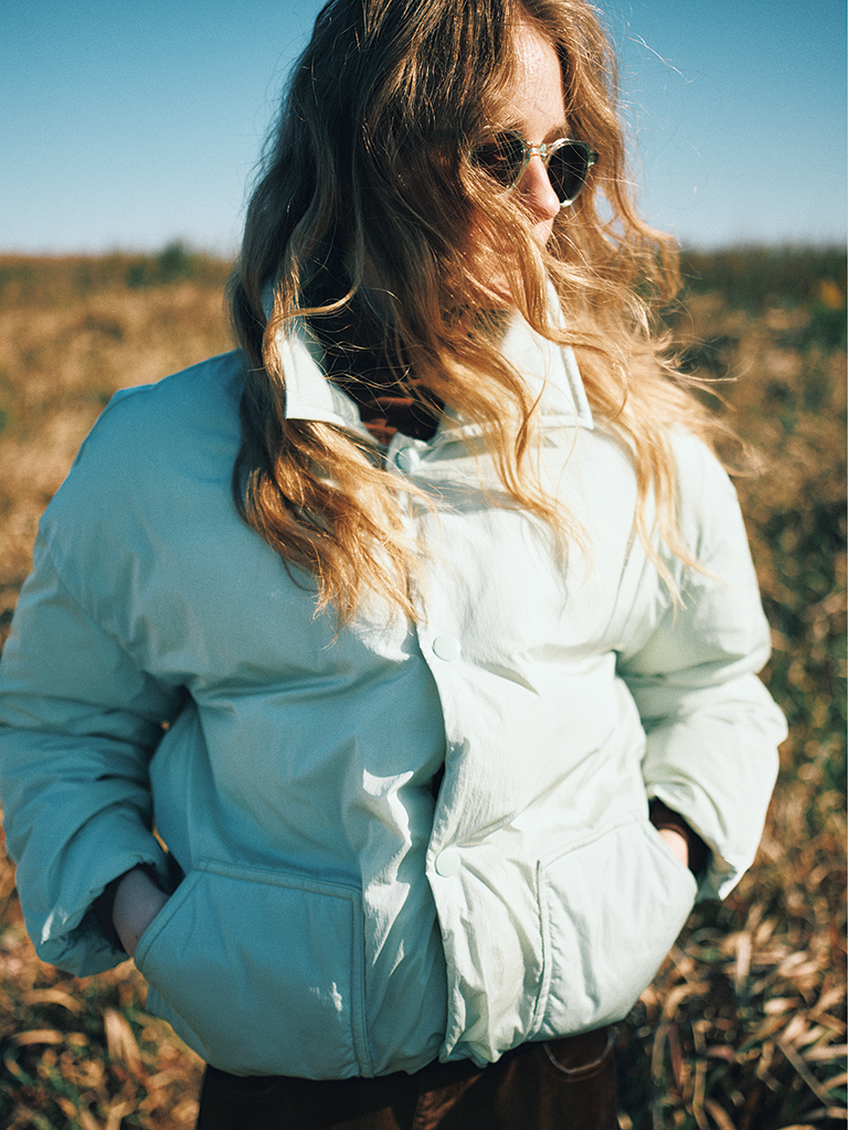 ミントグリーンダウンジャケット 39,600円/MIESROHE(MIESROHE ルミネ新宿1店) ブラウンタートルネックニット 12,000円/バナナ・リパブリック ブラウンフロッキーデニムパンツ 70,400円/オスロー(フィルム) サングラス 38,500円/CUBITTS(グリニッジ ショールーム)