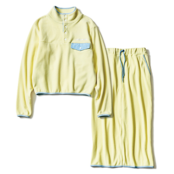 イエロー×ブルーフリーストップス 24,200円、イエロー×ブルーフリーススカート 24,200円/ともにTW 上下にやさしい色をまとっても、水色のパイピングでメリハリがつく。