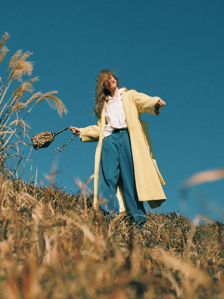 イエローロングコート 35,990円/ZARA(ザラ カスタマーサービス) 白カシミヤニットフーディ 75,900円/オスロー(フィルム) ブルーバルーンデニムパンツ 24,200円/Liesse レオパード柄巾着バッグ 30,800円/ASPESI(トヨダトレーディング プレスルーム)