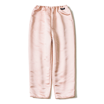 ピンクサテンパンツ 41,800円/SEA(エスストア) 着映える色×素材の組み合わせも、ゴムパンツなら力が抜けた印象に。ふっくらとした光沢で、浅いピンクでも膨張感なし。