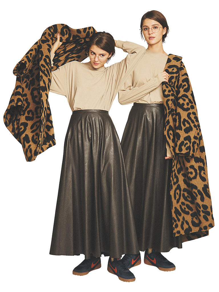 ブラウンフレアスカートは着まわし。ベージュロンT 19,800円/ATON(ATON AOYAMA) ベージュ×黒レオパード柄ロングコート 93,500円/THIRD MAGAZINE 眼鏡 25,800円/CARIN(スタードリーム ジャパン) タイツ 5,500円/ブルーフォレ(LITTLE LEAGUE INC.) スニーカー 10,450円/ナイキ スポーツウェア(NIKE カスタマーサービス)