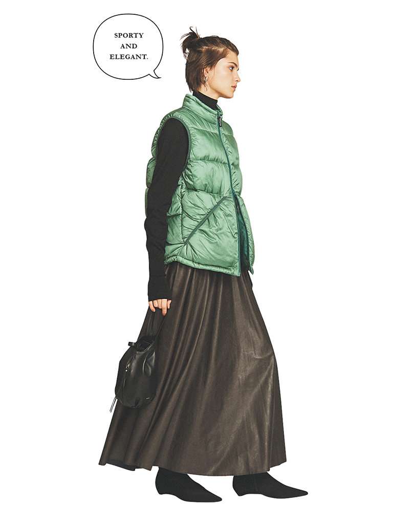 ブラウンフレアスカートは着まわし。グリーンダウンベスト 35,200円/WILD THINGS×Shinzone、黒タートルニット 25,300円/THE SHINZONE(ともにShinzone ルミネ新宿店) ピアス 74,800円/ミチ ウィルウェイ(フォーティーン ショールーム) バッグ 14,960円/ヴュレ(キューズ) ロングブーツ 参考商品/COS(COS 青山店)
