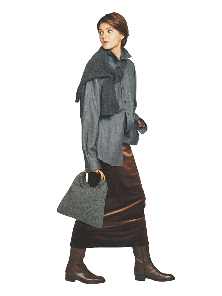 ブラウンタイトスカートは着まわし。グレーウールシャツ 26,400円/THE SHINZONE(Shinzone ルミネ新宿店) 肩に掛けたグレーニット 14,000円/バナナ・リパブリック バッグ 14,300円/HIGHLAND 2000(メイデン・カンパニー) ブラウンロングブーツ 55,000円/ヨシトデオランジェ(ニューロンドン)