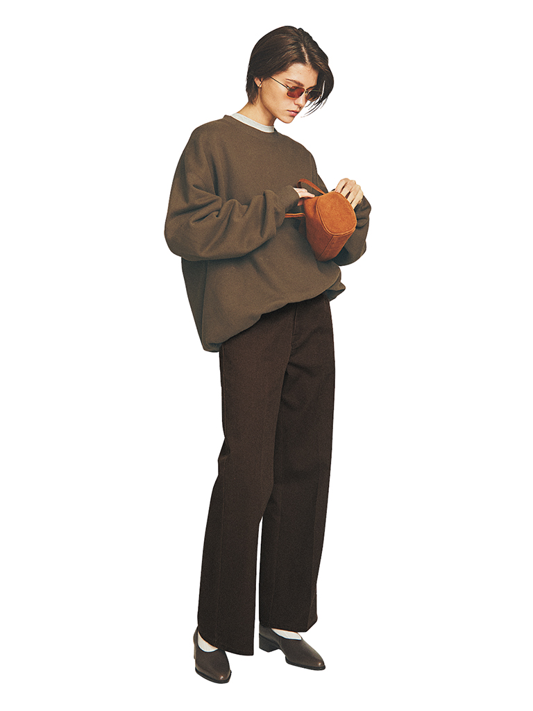 チノとそろえて、スウェットもブラウンをセレクト。白を合わせがちなインナーはグレーでトーンを落とし、ボーイッシュな上下に新鮮味と風格を呼び込んで。