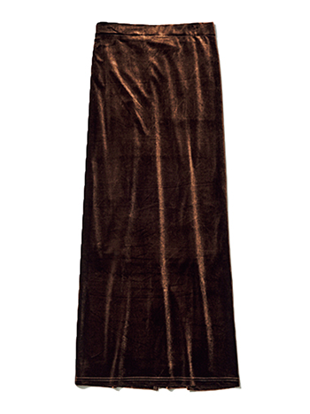 ブラウンベロアタイトスカート 9,900円/ユジーヌ(ジーンズ ファクトリー 卸団地本店) ベロアのリッチな起毛感が動くたびツヤめき、さっぱりとしたフォルムにニュアンスをプラス。素材に厚みがあるぶん、細身のシルエットなのに脚線のアタリを拾いにくくスタイルカバーにも向く1枚。ストレッチ性が高く、ロング丈でも足さばき良好。気になるほっこり感を払拭するバッグスリット。