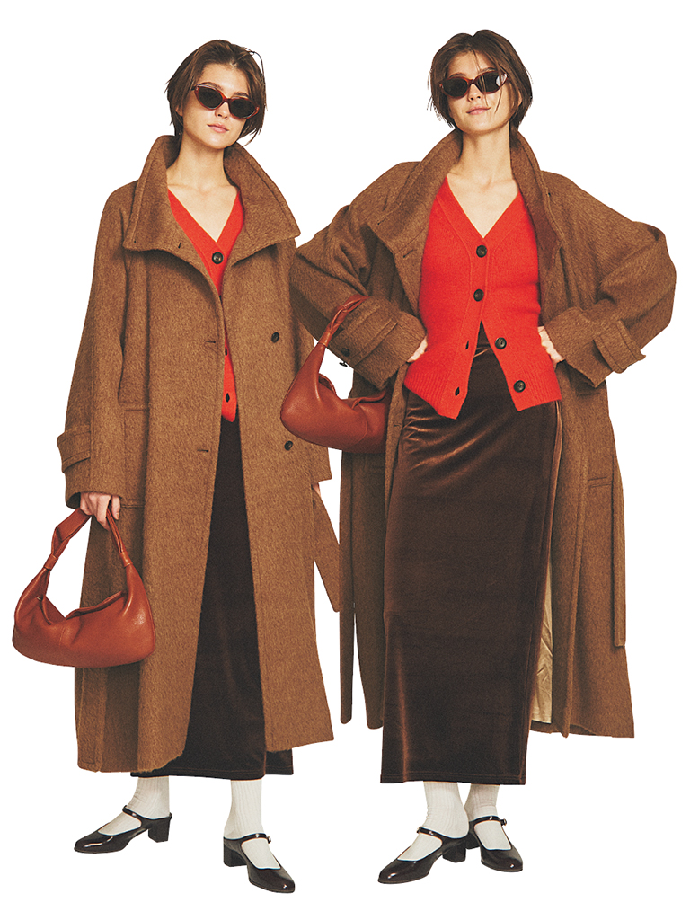 ブラウンタイトスカートは着まわし。共布ベルトつきベージュロングコート 132,000円/アダム エ ロペ オレンジVネックカーディガン 37,400円/ジャーナル スタンダード レサージュ(ジャーナル スタンダード レサージュ 銀座店) ブラウンサングラス 23,800円/CARIN(スタードリーム ジャパン) ブラウンバッグ 52,800円/テッセンクリエーション ソックス 3,300円/ブルーフォレ(LITTLE LEAGUE INC.) ブラウンパンプス 15,950円/A de Vivre