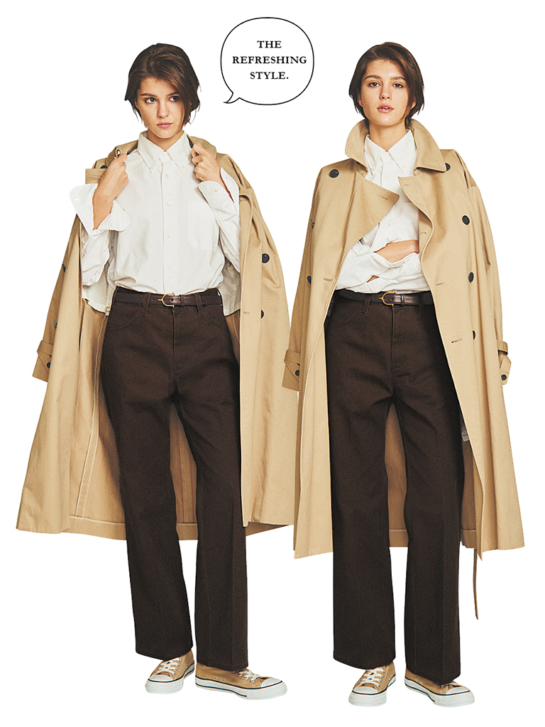 ブラウンチノパンツは着まわし。共布ベルトつきベージュトレンチコート 148,500円/ATON(ATON AOYAMA) 白ワイドシャツ 36,300円/INDIVIDUALIZED SHIRTS、ベルト 14,850円/TORY LEATHER(ともにメイデン・カンパニー) スニーカー 7,700円/コンバース(コンバースインフォメーションセンター)