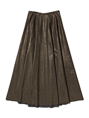ブラウンエコレザーフレアスカート 34,100円/HER. ドレープをたっぷり効かせた、華やかに広がるフレアスカート。余分な厚みをなくし美しく広がる軽やかなエコレザー。素材のハンサムさと色の奥ゆかしさが相まって、こびずに気品のある装いを実現。すっきりとしたウエストとキレイなシルエットでスタイルもよく。