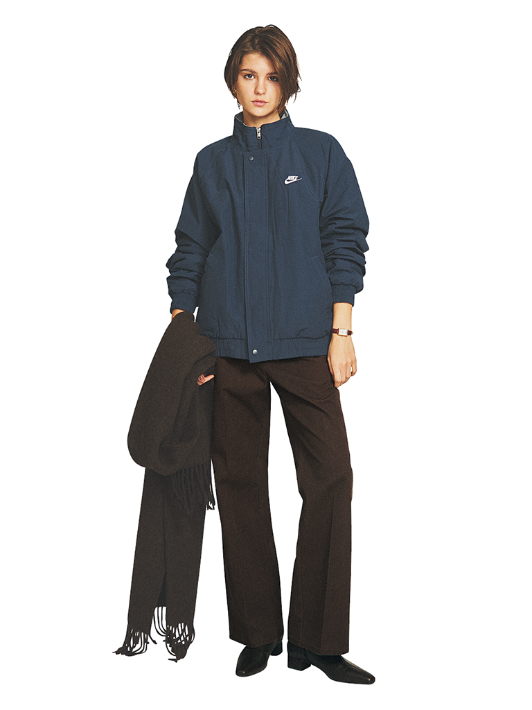 ブラウンチノパンツは着まわし。ネイビーナイロンジャケット 16,500円/ナイキ スポーツウェア(NIKE カスタマーサービス) ピアス 38,500円/リューク 時計 20,900円/マトウ(エイチエムエスウォッチストア 表参道) 手に持ったストール 24,000円/バナナ・リパブリック ブラウンショートブーツ 15,950円/ル タロン(ル タロン 有楽町マルイ店)