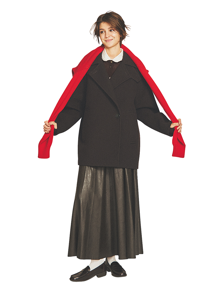 ブラウンフレアスカートは着まわし。ブラウンウールコート 46,200円/アダム エ ロペ ブラウンニットカーディガン 47,300円/チノ(モールド) 中に着たアイボリーショートスリーブシャツ 38,500円/SEA(エスストア) 肩に掛けた赤ニットカーディガン 52,800円/スローン(ザ ショップ スローン 新静岡セノバ店) ソックス 880円/靴下屋(タビオ) ブラウンローファー 14,080円/HARUTA