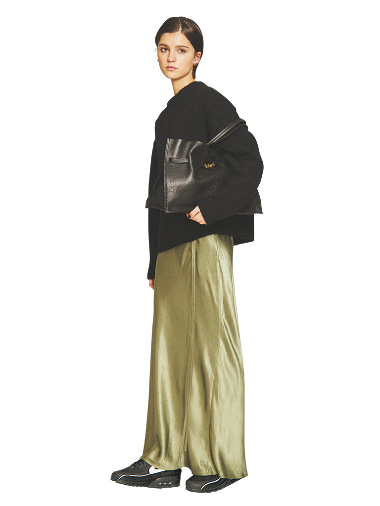 【POINT】サテンスカートをキレイなだけで終わらせない足元だけのテイストMIX。結果シンプルに見える黒であるのをいいことに、テイストに変化をつけて好感度の高い装いに個性を加算。やわらかなサテンを引き締める役割も。