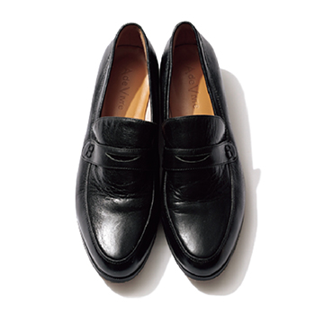 黒ローファー 16,390円/A de Vivre レトロに転ばない、装飾性をそいだローファー。つま先が細く尖っていることで、パンプスなみのシャープさ。