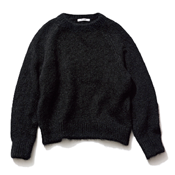 黒ニット 38,500円/SLOANE(ザ ショップ スローン 新静岡セノバ店) ファーに近い、アルパカ混の繊細な毛並み。色もサイズ感もシンプル、だからふわふわとした風合いが飾り気として効いてくる1枚。下手に盛りたてず、ささやかに特別感をほどこせるベーシックなのに一目置かれる存在。