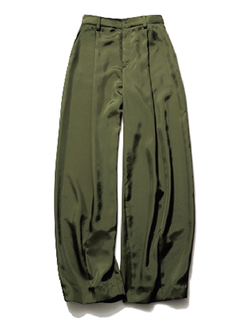 カーキサテンパンツ 39,600円/Sov.(フィルム) ノンストレスなはき心地のまま、光沢素材で気品を維持。キレイめパンツ的に使えるタック入り。