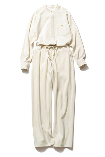白オールインワン 49,500円/ニコラジェンソン(リノウン) 肩ひじ張らずに着られる、適度なゆとりのオールインワン。オフホワイトのワークシャツ・トラウザーをベースにしたデザインで、ゆるいシルエットでもスマートに着られる。起毛加工をほどこしたポリエステル素材で、いまに必要なぬくもり感とストレスのない着心地を両得。