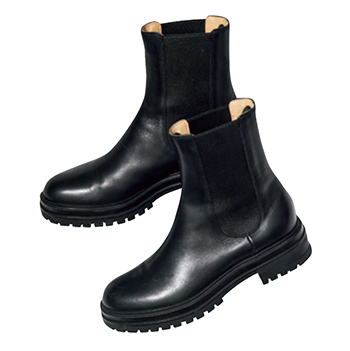 歩きやすく、足元に重みをもたらす存在として定着したメンズライクなサイドゴア。つま先に迫力が出るため、筒まわりがくびれたもので「すぎないボリューム感」に。