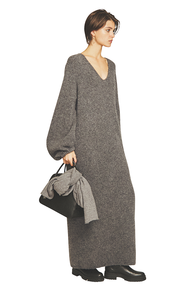 黒サイドゴアブーツははきまわし。グレーVネックニットワンピース 33,000円/HER. バッグ 79,200円/メゾン カナウ(ヤマニ) バッグに巻いたストール 55,000円/BODHI(alpha Brand Consulting)
