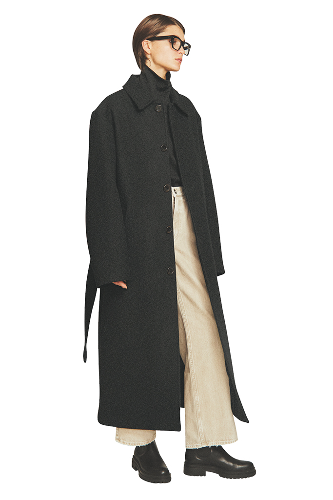 黒サイドゴアブーツははきまわし。共布ベルトつき黒ロングコート 89,100円、中に着た黒タートルニット 15,400円/ともにアモーメント ベージュデニムパンツ 27,500円/アッパーハイツ(ゲストリスト) 眼鏡 50,380円/Oliver Peoples(ルックスオティカジャパン カスタマーサービス)
