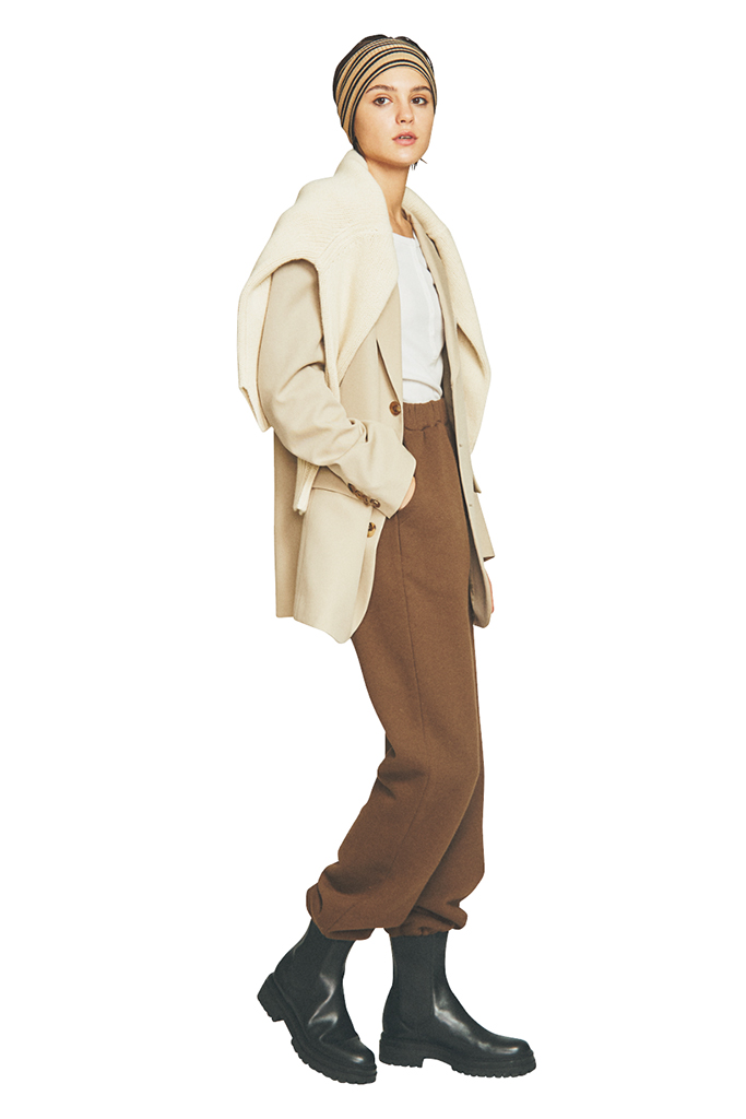 黒サイドゴアブーツははきまわし。ベージュワイドジャケット 61,600円/SEA(エスストア) 中に着た白ハーフボタンTシャツ 3,490円/Gap 肩に掛けた白ワイドニット 44,000円/thehighlights ブラウンスエットパンツ 10,560円/Sea Room lynn(シールームリン神宮前店) ターバン 8,800円/ラ メゾン ド リリス(ジャーナル スタンダード レサージュ 銀座店)