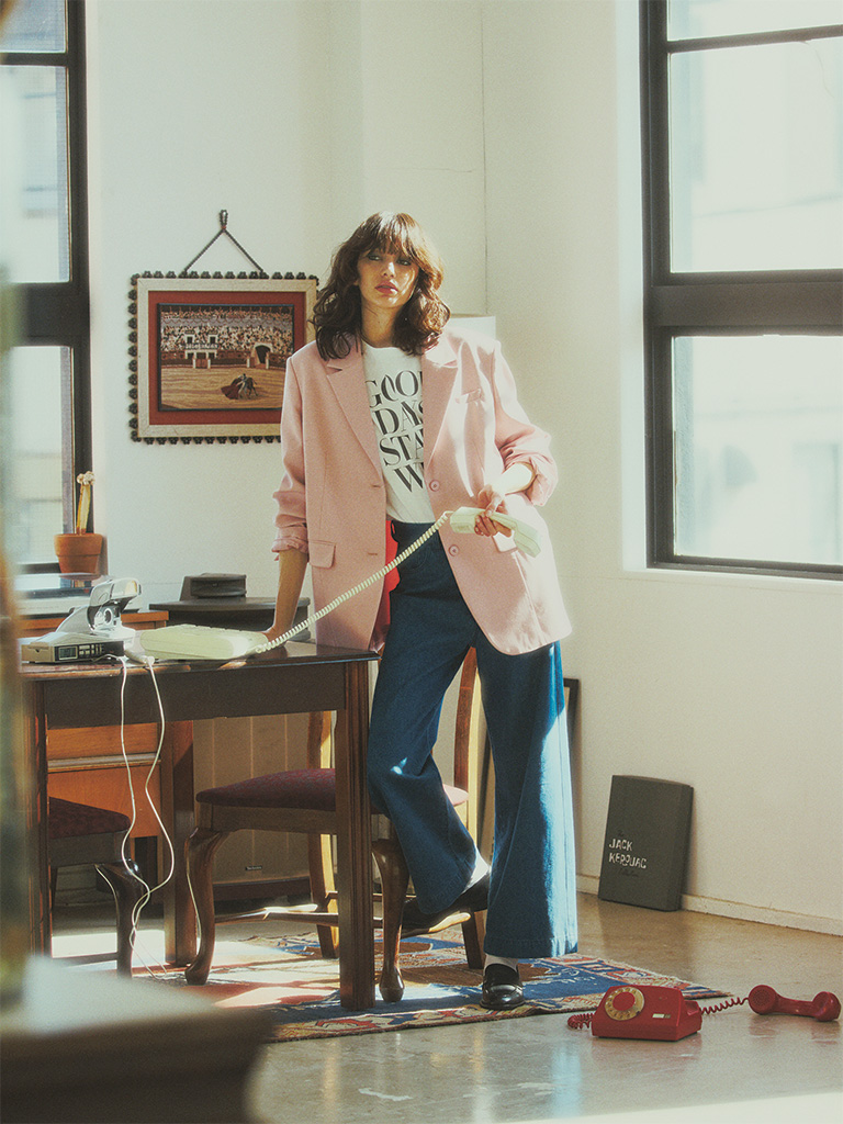 春らしい白みがかったピンクでジャケットを新調。肩が余り、ヒップも隠れるほどのビッグサイズなら、可愛い色みも甘く転ばずハンサムな印象に。加えて、そのボクシーなシルエットが華奢なスタイルを引き立てる役割も。淡色ながらきちんと見える、ほどよく厚手の素材感。