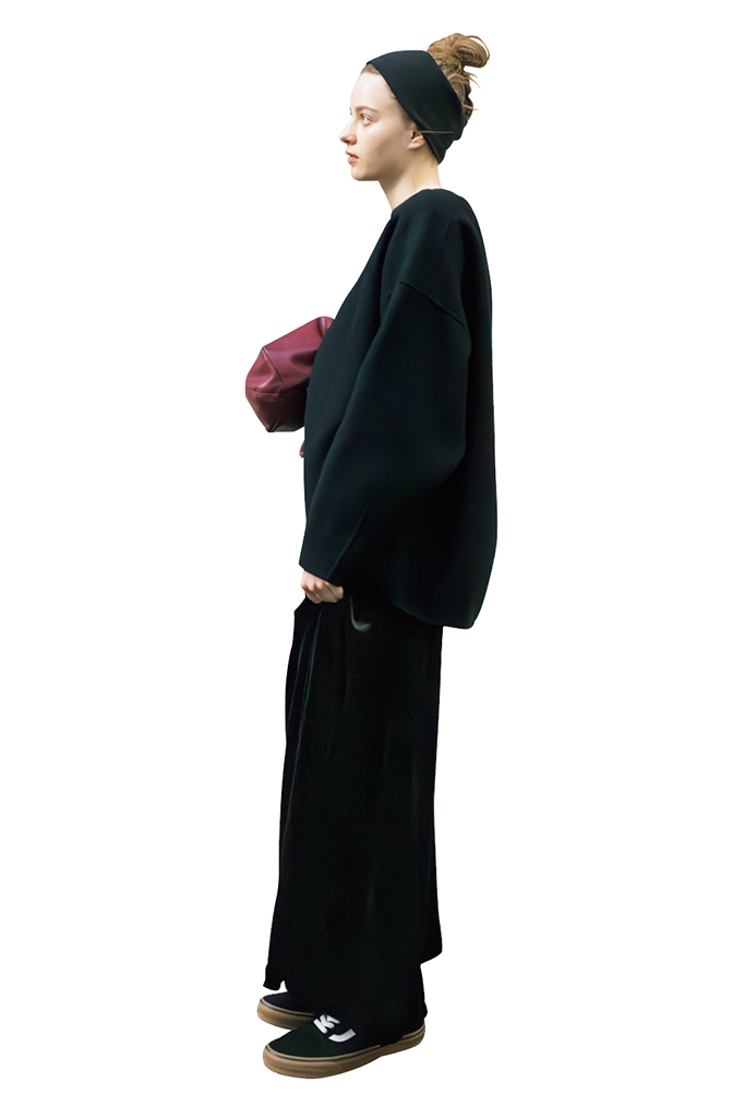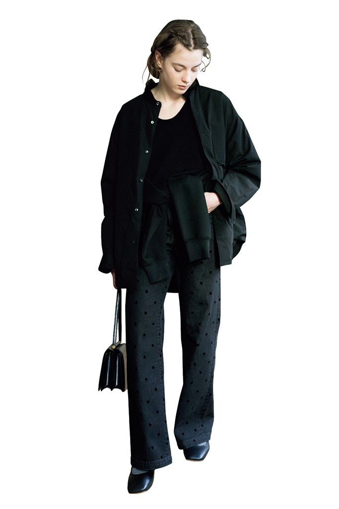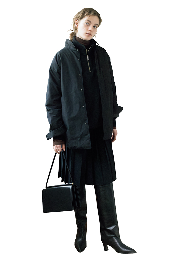 見慣れない立体感で、無地の黒が単調に見えない鮮度と迫力が誕生。ボトムに特徴をもたせたぶん、トップスは極力コンパクトに、足元のベージュで目立たせないことで、複雑な着方もシンプルに落ち着く。