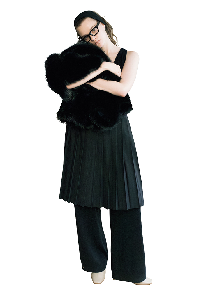 ちょっとしたパーティなど、フォーマルな場面でも頼れる黒。ただし、隙のない色により「がんばりすぎ」と思われる可能性も。素材の陰影やゆれるシルエットで表情をつければ、+ファーの特別感にも余裕が宿る。
