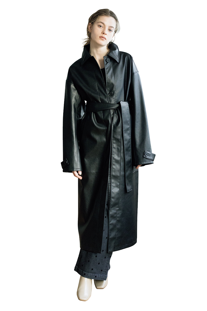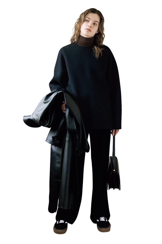 硬派な黒の印象がマイルドに変わる、ふんわりとやさしい起毛感。そもそもが美しいシルエットで選んでいるから、やわらかな素材でまとめてもやぼったさはなし。飾りとしてレザーを投入し、仕上がりを微調整。
