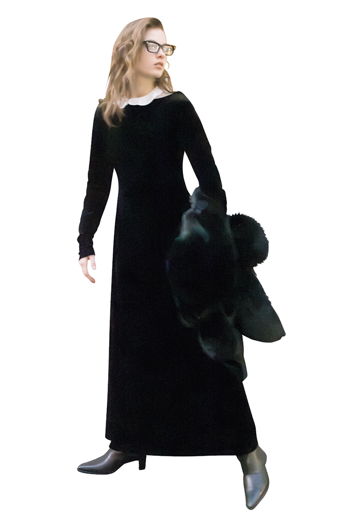 ふっくらとしたダウンシャツの下にベロアのワンピースを重ねて質感違いのぬくもりを。スタイルアップ必須の彼女にとって、防寒はやや難題。ダウンながらキレのいいシャツのデザイン性とベロアの落ち感で膨張を回避。密着度の高いブラウンタートルも仕込んで、色でもあたたかさを補えば完璧。