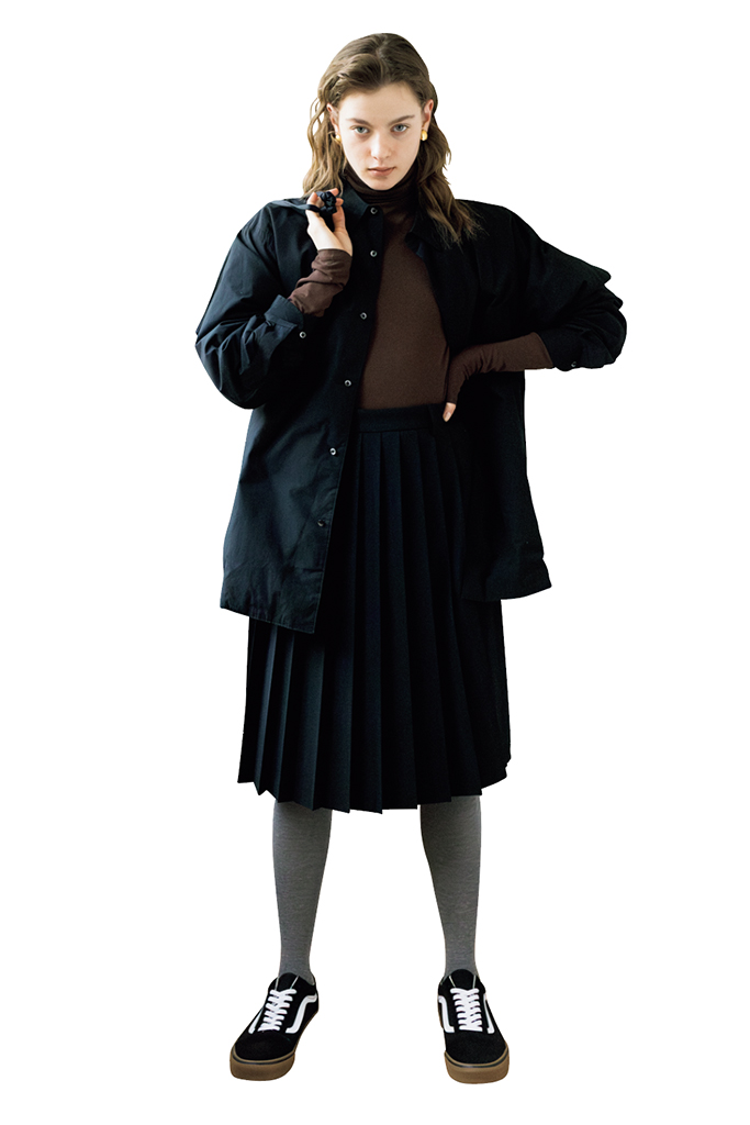 クラシック映画に出てきたヒロインのようにひざ丈のプリーツスカートを行儀よく。ウールのトップスの下には白レースを仕込み、足元はグレーのタイツとバレリーナ風のフラットシューズ。手持ちの範囲内で淑女のように装って趣のある黒の完成。トレンチ風のレザーコートも忘れずに。