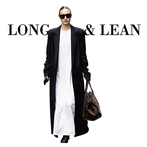 視線を縦に促すワンピースに、コートをはおって縦ラインを強化。明暗差も相まってスタイルアップが望めると同時に、冗長になりがちなマキシ丈のレイヤードがうまく整う。