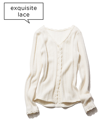 オフ白レースライクニットトップス 19,250円/Ameri レースの繊細さをニットで表現し、センシュアルなムードとぬくもりを両立した風合い。ひかえめな透け感で1枚でも着やすい。