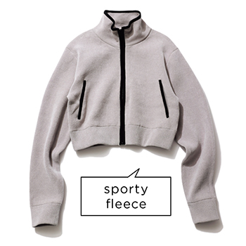 グレーフリースタッチニットジャケット 25,300円/NKNIT 短い毛足を高密度に編み上げた、つるりとした手ざわり。黒のパイピングが、アウトドア感をかもすアクセント。
