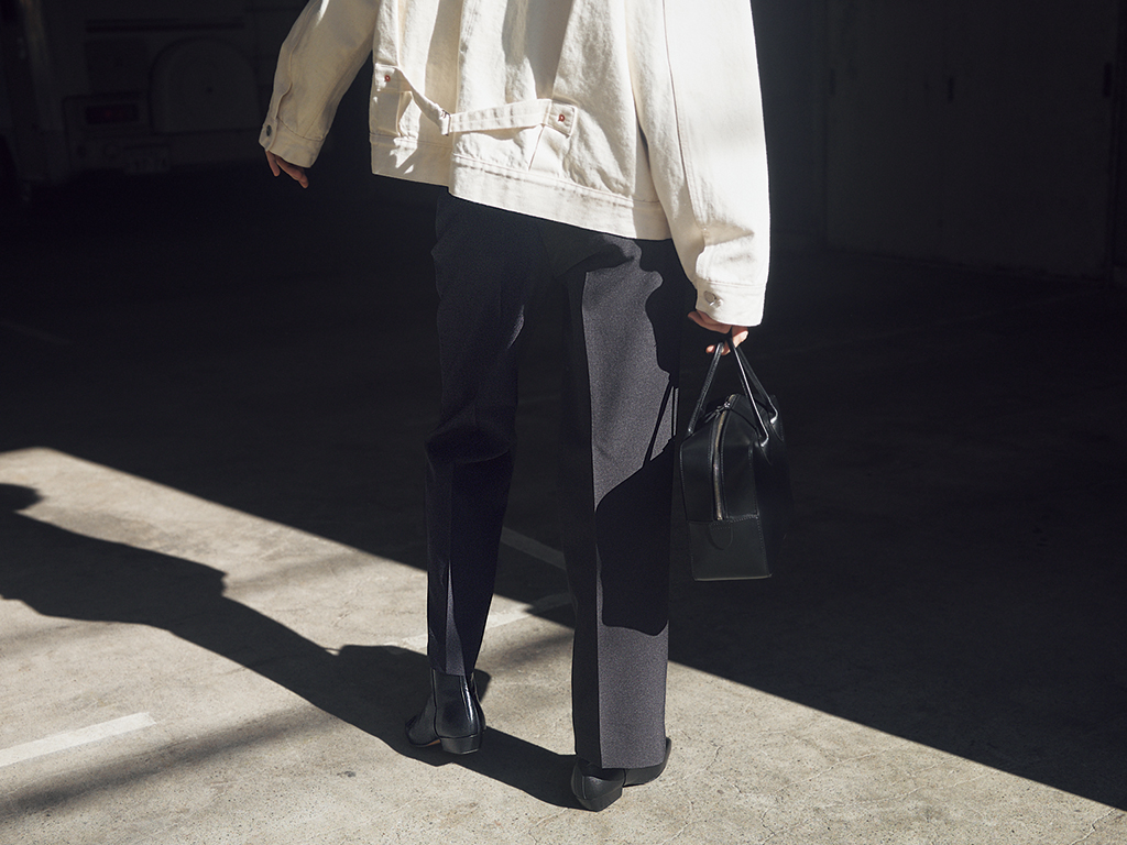 すっきりしつつも余裕を感じるツータック。腰回りはゆとりがありながら、肝心のレッグラインはシャープなテーパードシルエットに。マーベルト仕様でタックインしたときも端正な見た目。背面にもセンタープレス入り。