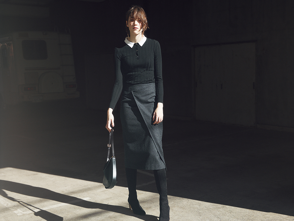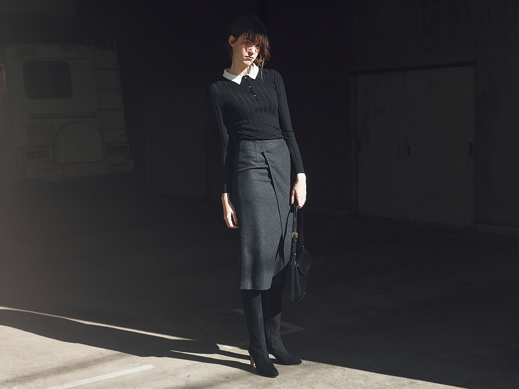 キリッとしたタイトスカートに適度な隙をもたらすグレー。とはいえ膨張見えは避けたいから、切れ味は残せるダークトーンをセレクト。