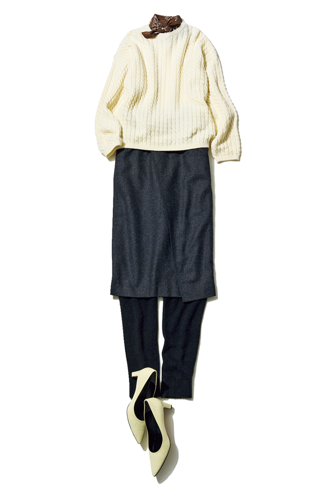 グレーツイードスカートは着まわし。白ニット 29,700円/BIYŌMA(ツカモトコーポレーション) 黒ニットパンツ 31,900円/styling/ 首に巻いたバンダナ 3,300円/SEA(エスストア) パンプス 51,700円/KATIM