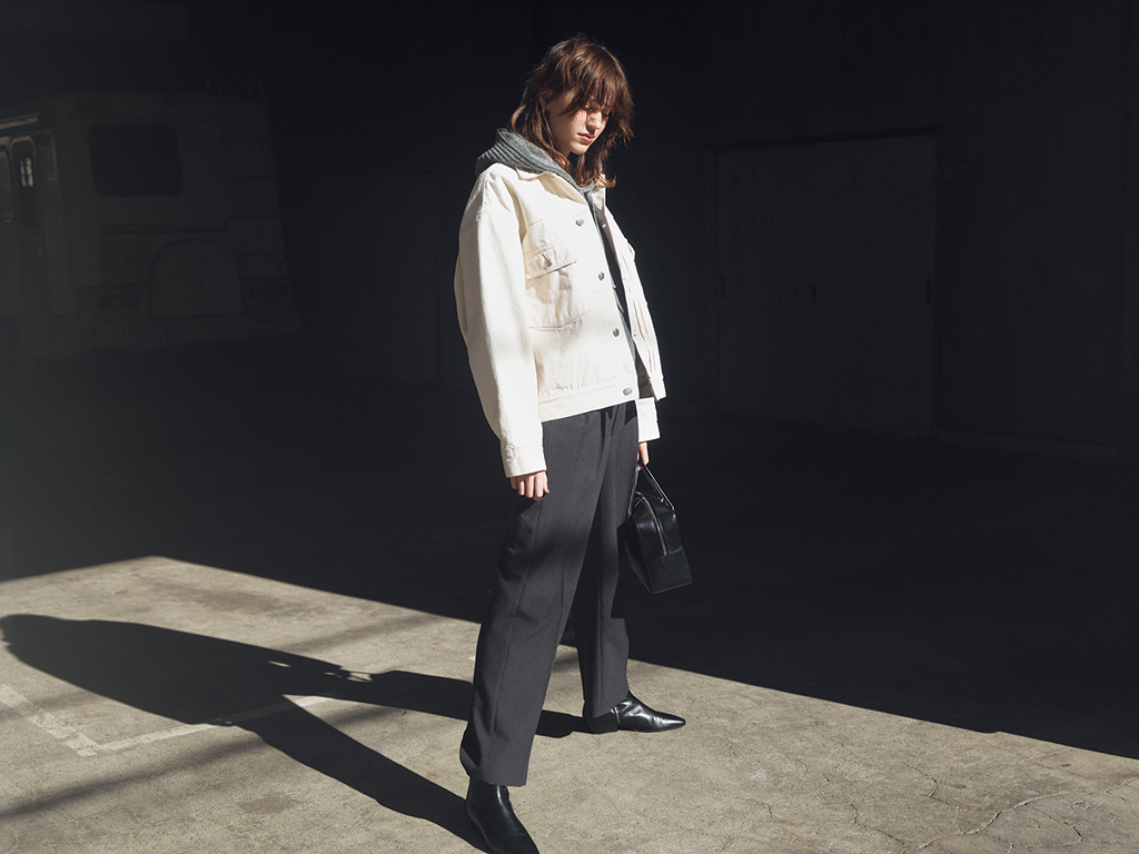 グレーセンタープレスパンツ 23,100円/THE SHINZONE(Shinzone ルミネ新宿店) グレーニットフーディ 55,000円/THIRD MAGAZINE 白デニムジャケット 79,200円/beautiful people(ビューティフルピープル 青山店) バッグ 79,200円/MAISON CANAU(ヤマニ) ブーツ 45,000円/バナナ・リパブリック