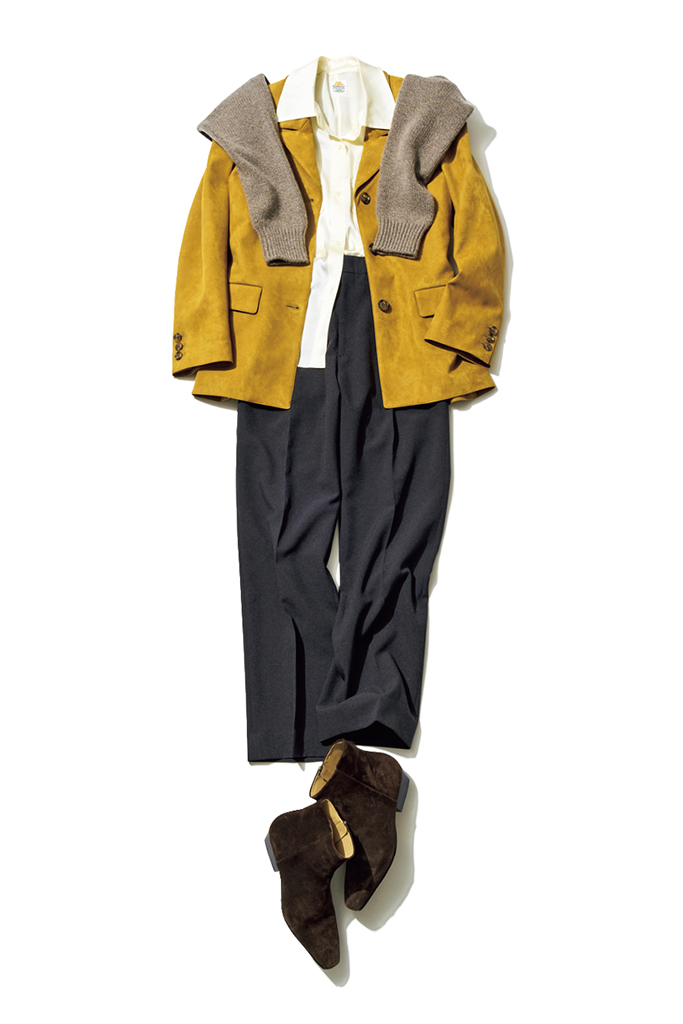グレーセンタープレスパンツは着まわし。白サテンシャツ 28,600円/ベッド&ブレックファスト(グリードインターナショナル) ベージュジャケット 165,000円/BIYŌMA(ツカモトコーポレーション) 肩にかけたニット 52,800円/SLOANE(ザ ショップ スローン 新静岡セノバ店) ブーツ 45,000円/バナナ・リパブリック