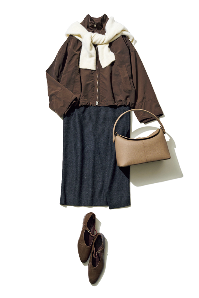 旬のブラウンとなじみよく、気になるほっこり感だけをそぎ落とせるのも暗グレーの魅力。足元だけが抜けて見えないよう、肩に巻いた白ニットで顔まわりもすっきりと。