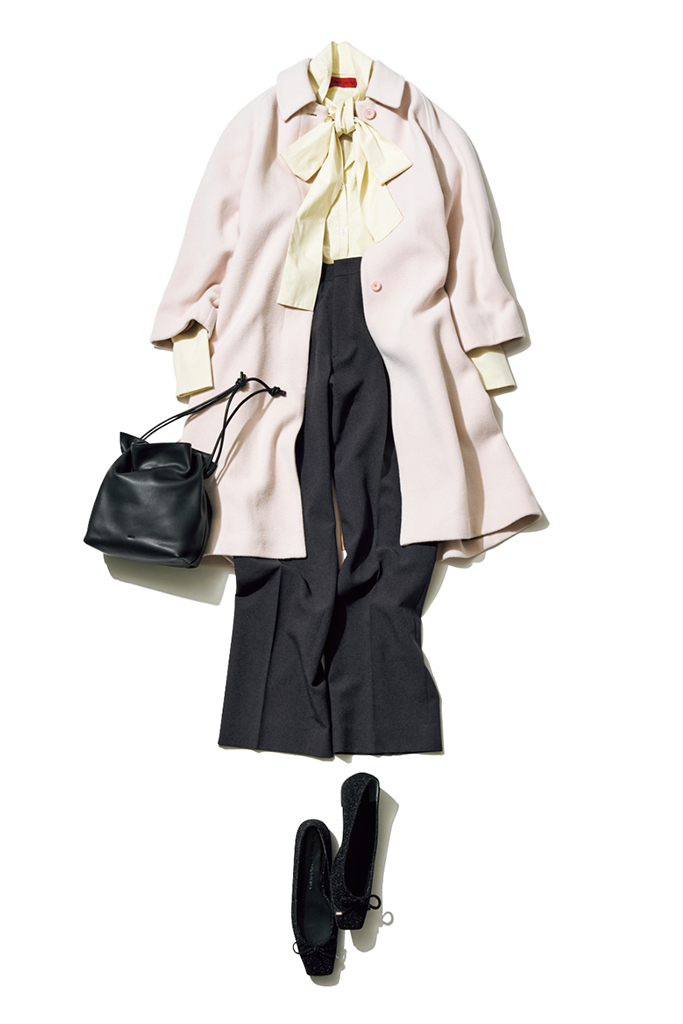 かわいいイメージが強いピンクのコートには、ボウタイ+スラックスの直球なきちんと感が最適。