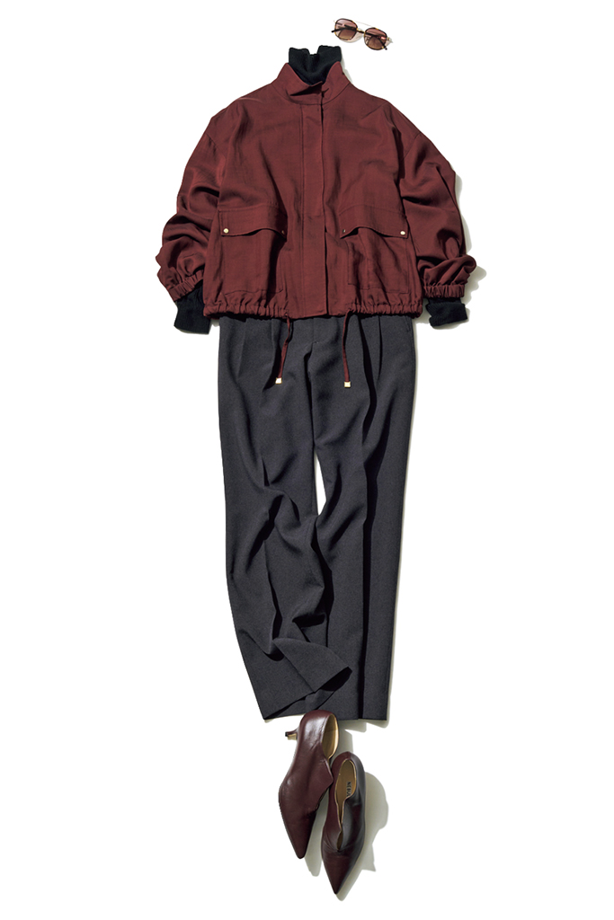 グレーセンタープレスパンツは着まわし。黒タートルネックニット 29,700円/SLOANE(ザ ショップ スローン 新静岡セノバ店) バーガンディブルゾン 52,800円/martinique(マルティニーク ルミネ横浜) サングラス 15,000円/COS(COS 青山店) シューズ 79,200円/ネブローニ(アルアバイル)