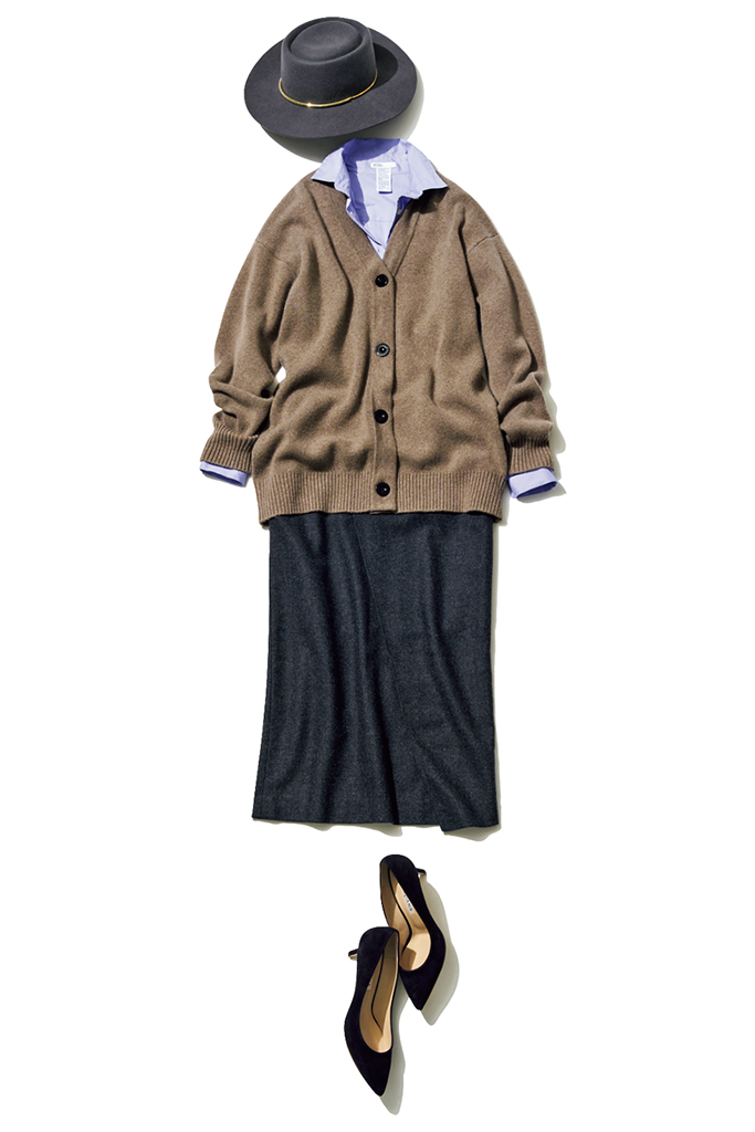 着くずさずとも力が抜ける、ビッグサイズのシャツとニットカーディガンもポイントに。上は幅広・下は細身のメリハリが効いたVシルエットで、ゆるいレイヤードもバランスよく。