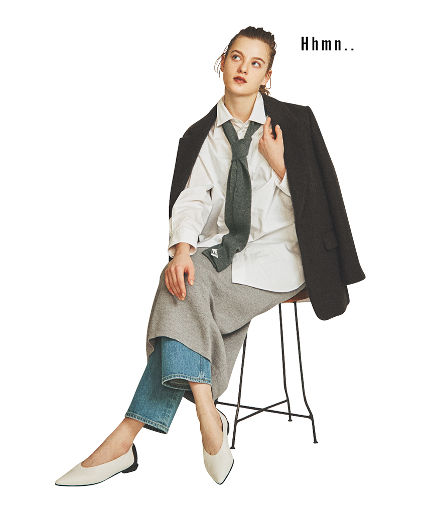 白シャツとグレーニットスカートは着まわし。ジャケット 50,600円/スピック&スパン(スピック&スパン ルミネ有楽町店) デニムパンツ 30,800円/YANUK(カイタックインターナショナル) ネクタイ 2,530円/CITEN(ユナイテッドアローズ カスタマーサービスデスク) シューズ 36,300円/SHISEI(アイネックス)