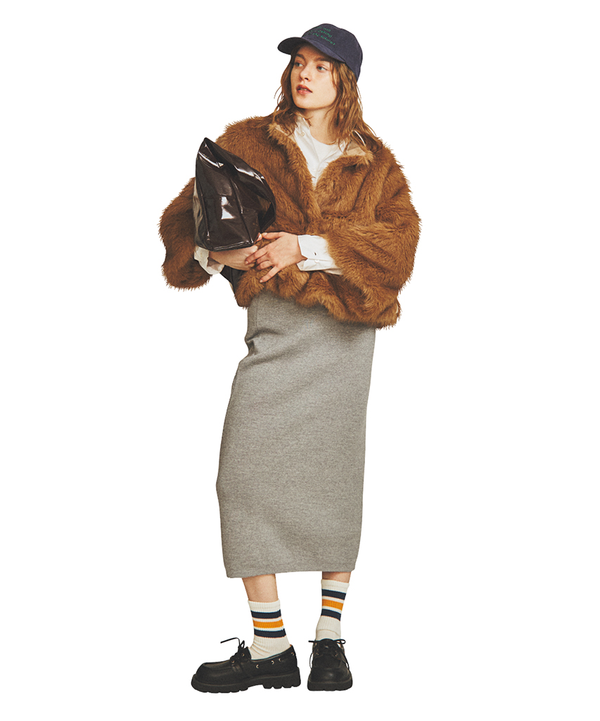 白シャツとグレーニットスカートは着まわし。ファージャケット 48,400円/ティアラ 中に着たカットソー 9,680円/SLOANE(ザ ショップ スローン 新静岡セノバ店) キャップ 3,960円/CITEN(ユナイテッドアローズ カスタマーサービスデスク) バッグ 20,900円/ACOC(ジャック・オブ・オール・トレーズ プレスルーム) ライン入りソックス 1,100円 靴下屋(タビオ) シューズ 11,900円/CHARLES & KEITH(CHARLES & KEITH JAPAN)